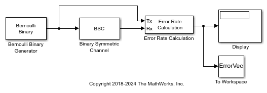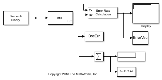 The Binary Symmetric Channel block introduces errors to the input signal transmitted through a binary symmetric channel. The errors are introduced based on the specified Error probability. For more information, see Tips.