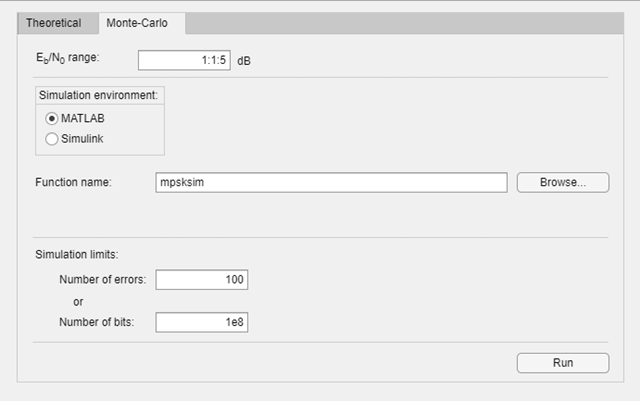 Use the Bit Error Rate Analysis app to compute the BER as a function of . The app analyzes performance with either Monte Carlo simulations of MATLAB® functions and Simulink® models or theoretical closed-form expressions for selected types of communications systems. The code in the mpsksim.m function provides an M-PSK simulation that you can run from the Monte Carlo tab of the app.