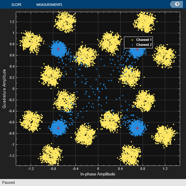 yVecPkt = zeros(ttlNumSym,numPackets); errVecPkt = zeros(ttlNumSym,numPackets); wgtVecPkt = zeros(ttlTaps,numPackets); dfeq2 = comm.DecisionFeedbackEqualizer( ... 'Algorithm','LMS', ... 'NumForwardTaps',nFwdTaps, ... 'NumFeedbackTaps',nFdbkTaps, ... 'ReferenceTap',refTap, ... 'StepSize',stepsz); for p = 1:numPackets [yVecPkt(:,p),errVecPkt(:,p),wgtVecPkt(:,p)] = ... dfeq2(rxVec(:,p),txVec(1:numTrainingSym,p)); for q=1:ttlNumSym updateFigures(errPlot,wStem,hStem,scatPlot, ... errVecPkt(q,p),wgtVecPkt(:,p),yVecPkt(q,p), ... pg,q,ttlNumSym); end
