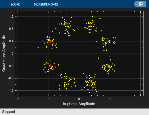 Run the slex_constellation_diagram model and observe the 8-PSK constellation. The received data points are shown in yellow while the red ‘+’ symbols represent the ideal constellation locations.