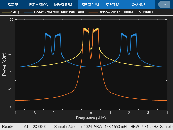 Plot the input signal, the modulated sidebands, and the demodulated signal by using a spectrum analyzer.