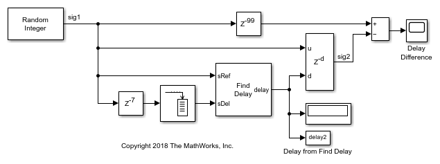 The Find Delay block finds the delay between a signal and a delayed, and possibly distorted, version of itself. This is useful when you want to compare a transmitted and received signal to find the bit error rate, but do not know the delay in the received signal. This block accepts a column vector or matrix input signal. For a matrix input, the block outputs a row vector, and finds the delay in each channel of the matrix independently. For more information about signal delays, see Delays in Communication Systems.