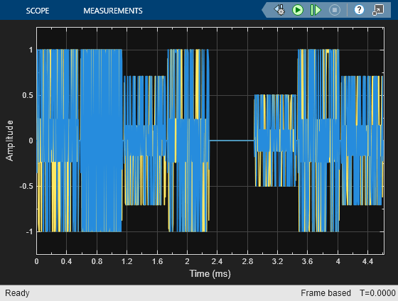 Code generation defaults to MEX code generation when you do not specify a build target. By default, codegen names the generated MEX function createDownlinkWaveform_mex. Generate a MEX function from the createDownlinkWaveform helper function, and then run the MEX function to create two TDMA frames.