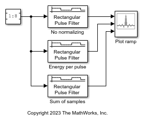The Ideal Rectangular Pulse Filter block upsamples and shapes the input signal using rectangular pulses. After replicating input samples, the block can also normalize the output signal and apply a linear amplitude gain.