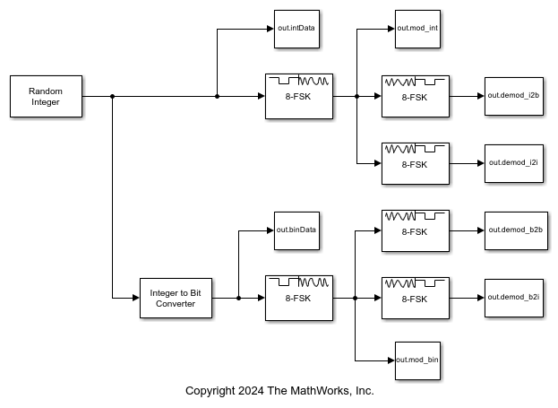 The upper path modulates data by using an 8-FSK Modulator block configured to accept integer data, and then demodulates the data and outputs binary and integer data from separate 8-FSK Demodulator blocks.