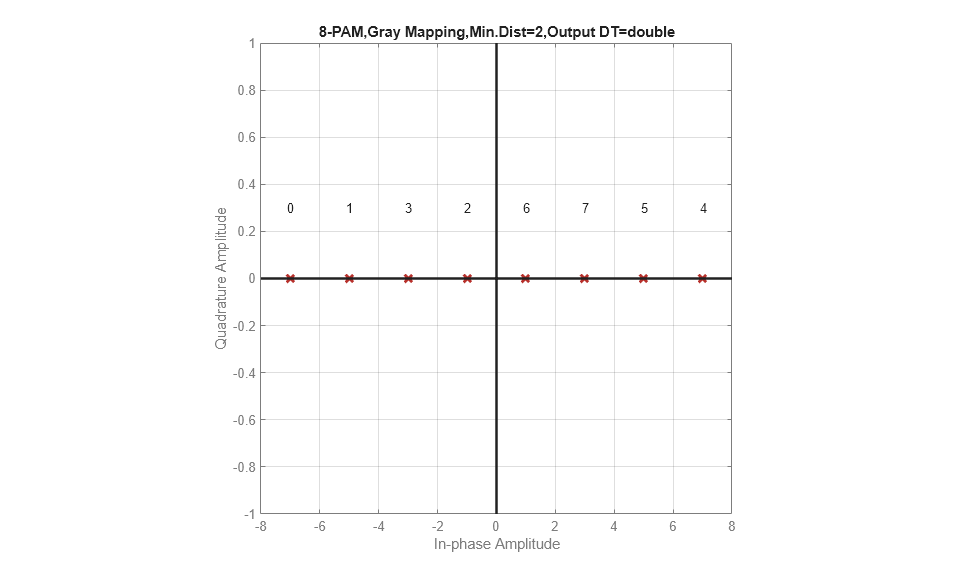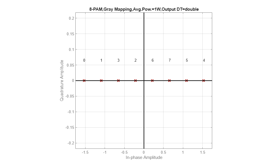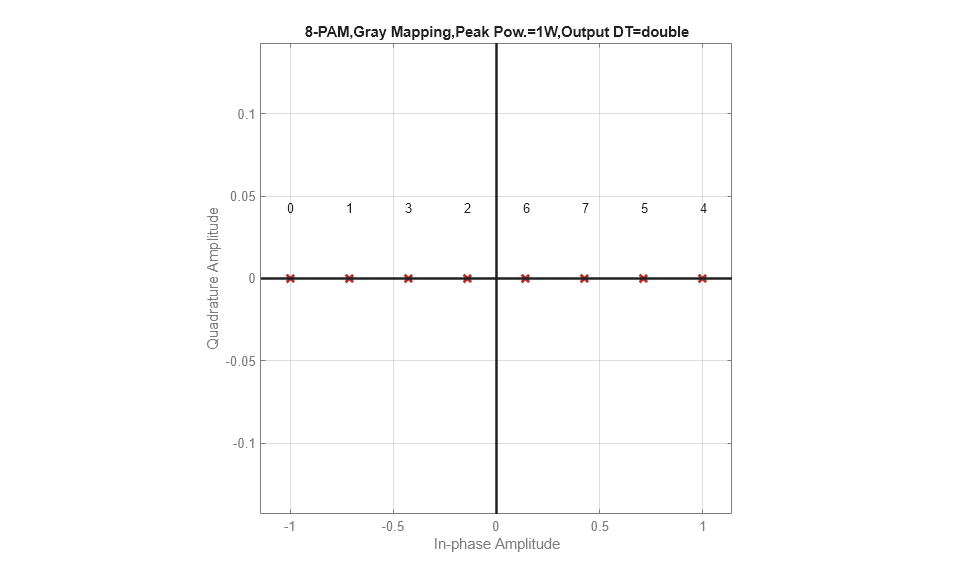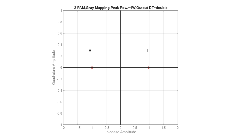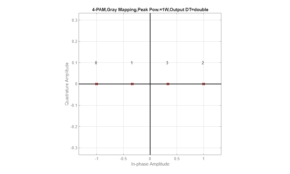 The block outputs the real-valued constellation symbols as a complex signal with the imaginary part equal to zero. Constellation symbols map an integer m in the range [0, (M – 1)] to the complex value 2m – M + 1. M is the modulation order as specified by the M-ary number parameter.