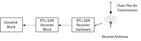 This diagram shows the conceptual overview of receiving radio signals in Simulink by using the Communications Toolbox™ Support Package for RTL-SDR Radio. Simulink interacts with the RTL-SDR Receiver block to receive signals from the radio.