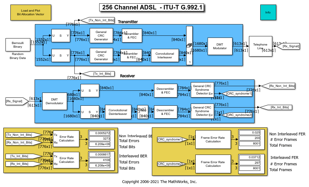 The transmitter portion of the model, shaded in blue at the top of the model, contains two parallel paths. One path (the fast buffer) processes the first 776 bits of each 1552-bit data frame, while the other path (the interleaved buffer) processes the last 776 bits of each data frame. Each path appends eight cyclic redundancy check (CRC) bits to its 776-bit frame, scrambles the bits, and encodes them using a shortened Reed-Solomon code. The scrambling and encoding operations interpret the bits as integers between 0 and 127. In the second path but not the first, a Convolutional Interleaver block interleaves the encoded data. This interleaving operation increases the second path's resistance to burst errors but also adds latency. Finally, the data from the two routes is concatenated and modulated. Data from the fast buffer is modulated to the low frequency subcarriers, while data from the interleaved buffer is modulated to the high frequency subcarriers, according to the bit allocation vector b. This example assumes that the bit allocation vector is known and uses the vector to calculate the channel. Click commadsl;get_param('commadsl','ModelWorkspace');commandwindow to see in the MATLAB® Command Window the calculations involved.