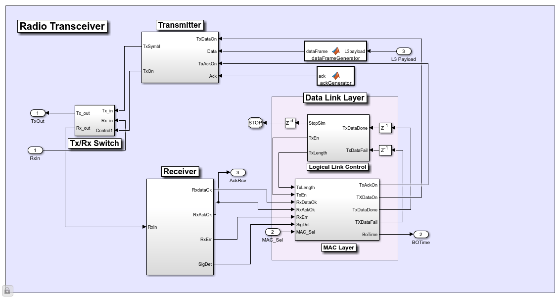 The MAC layer operates at a very fine timescale (every 0.8 microseconds), as the backoff duration is typically much shorter than the duration of a data frame. As a result, the Simulink model is scalar-based (i.e., the length of most signals is equal to 1) and the MAC/PHY layers do not process frames, i.e., batches of samples.