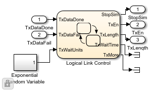 The Logical Link Control (LLC) sublayer is responsible for injecting data packets into the transceiver. It is mainly implemented using a Stateflow chart. The packet interarrival time is exponentially distributed, which corresponds to a Poisson process.
