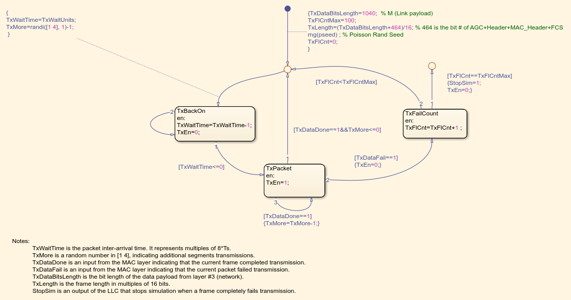 Then, the Stateflow chart counts down the packet inter-arrival time until the next packet arrives. This chart also models the segmentation of large packets into smaller data frames by determining the number of additional frame transmissions ("TxMore").