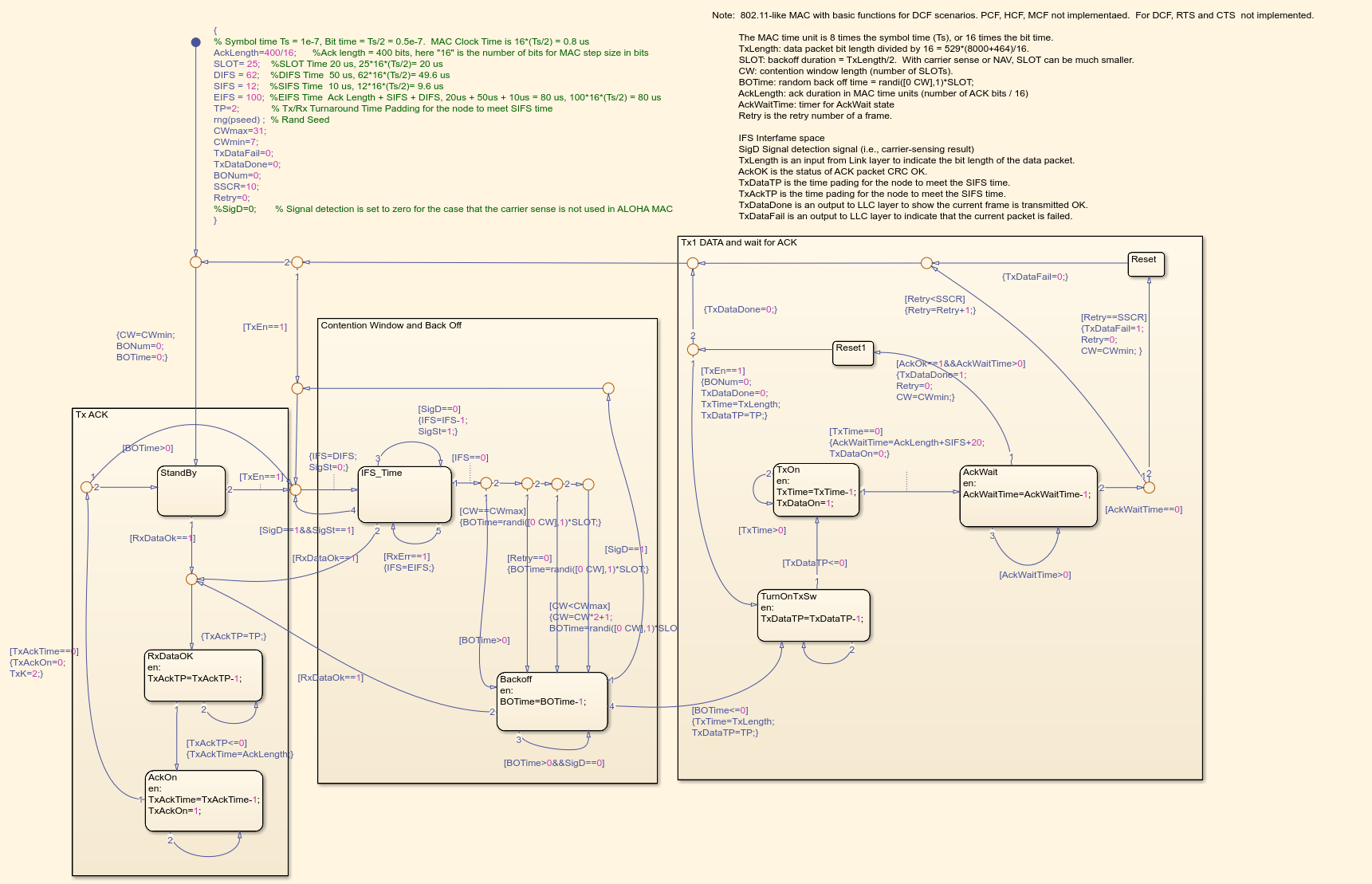 When the top-level MAC switch is set to CSMA/CA, the MAC subsystem of the Data link layer essentially operates as the following Stateflow chart:
