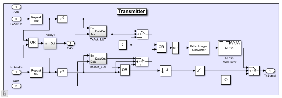 Transmitter: The transmitter performs QPSK modulation on the MPDU bits. The bit rate is 20 MHz and the symbol rate is 10 MHz. The QPSK symbols are subsequently filtered with the raised cosine filter of the "Tx/Rx Switch" subsystem.
