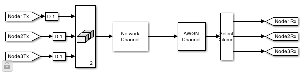 Channel: The filtered PHY waveform passes through a network channel, which imposes multipath fading and white Gaussian noise. The network channel allows each node to receive superimposed signals transmitted by multiple other nodes. Multipath fading is applied using the NetworkChannel System block. White noise is added using the multichannel capability of the AWGN Channel block.