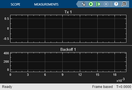 Model simulation shows one scope for each transceiver. Each scope depicts the transmitted signal (top axes) and the backoff counter (bottom axes) for each transceiver.