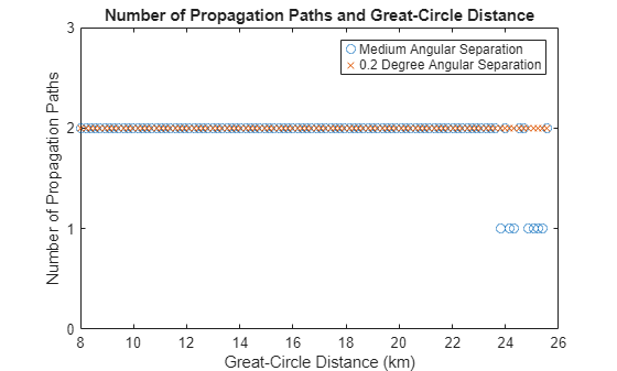 numRays = cell2mat(cellfun(@numel,rays,"UniformOutput",false)); numRaysLessSeparation = cell2mat(cellfun(@numel,raysLessSeparation,"UniformOutput",false)); figure plot(range/1e3,numRays,"o",DisplayName="Medium Angular Separation") hold on plot(range/1e3,numRaysLessSeparation,"x",DisplayName="0.2 Degree Angular Separation") hold off ylim([0 3]) yticks([0 1 2 3]) title("Number of Propagation Paths and Great-Circle Distance") xlabel("Great-Circle Distance (km)") ylabel("Number of Propagation Paths") legend