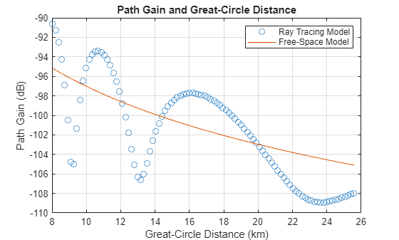 figure plot(range/1e3,-rayPL,"o",DisplayName="Ray Tracing Model") hold on plot(range/1e3,-FSPL,DisplayName="Free-Space Model") hold off grid on title("Path Gain and Great-Circle Distance") xlabel("Great-Circle Distance (km)") ylabel("Path Gain (dB)") legend