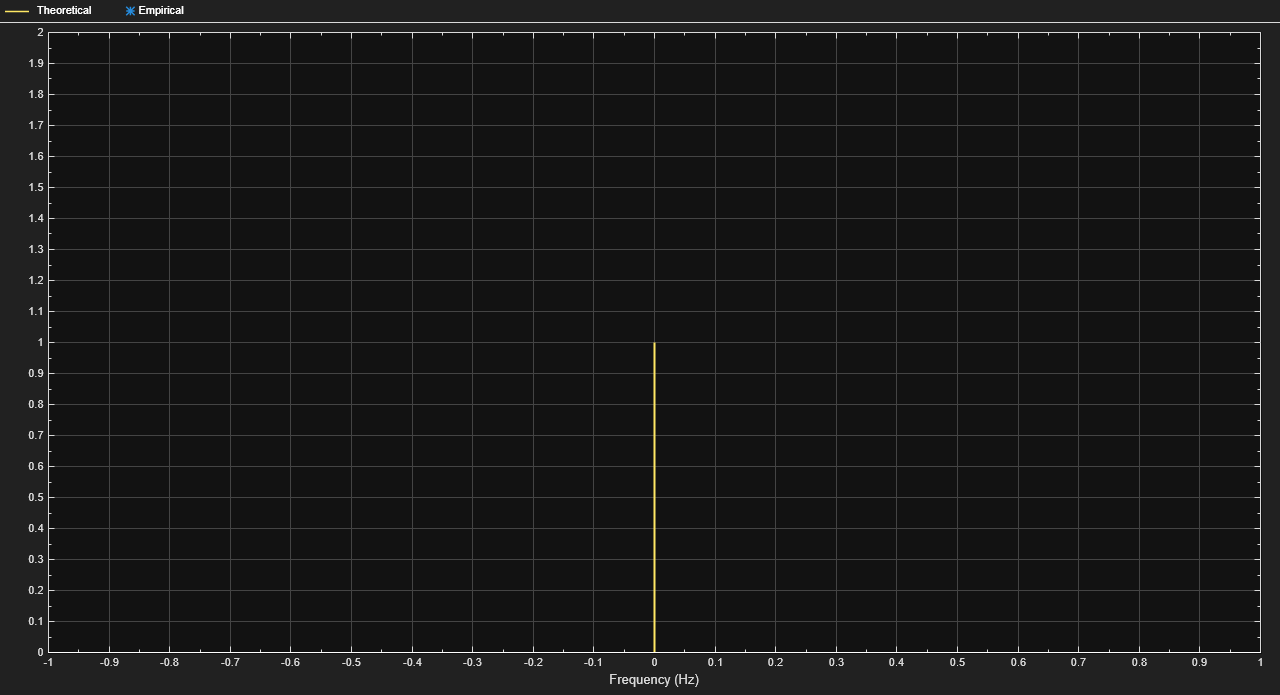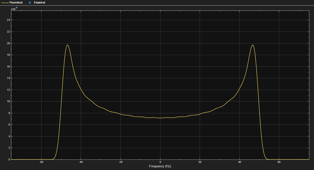 The Doppler spectrum plot displays both the theoretical Doppler spectrum and the empirically determined data points. When the internal buffer is completely filled with filtered Gaussian samples, the empirical plot is updated. The empirical plot is the running mean of the spectrum calculated from each full buffer. The samples needed before the next update is displayed is a function of the sample rate and the maximum Doppler shift.
