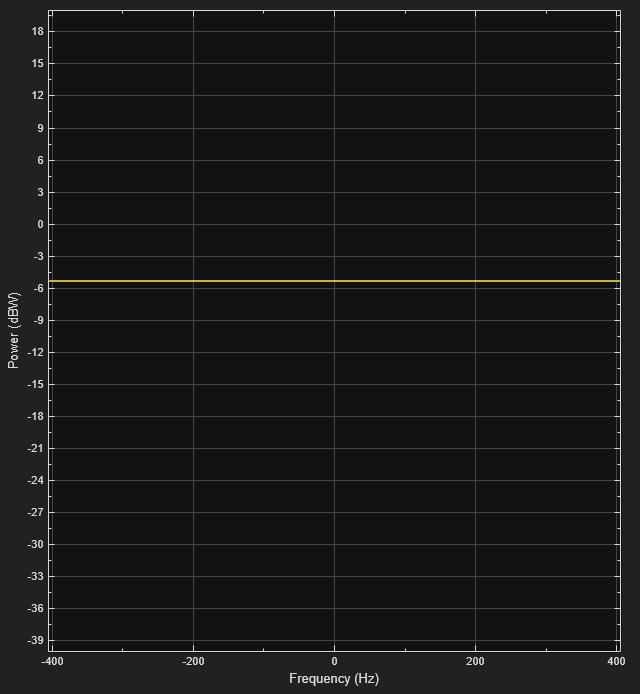 The impulse and frequency responses show that the channel behaves as though it were flat. This flat response is because the signal bandwidth, 800 Hz, is much smaller than the coherence bandwidth, 50 kHz.