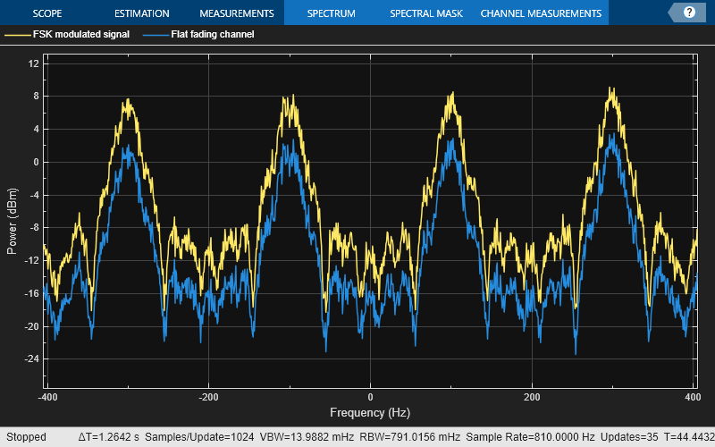 Pass an FSK signal through a Rayleigh multipath fading channel. Change the signal bandwidth to observe the impact of the fading channel on the FSK spectrum.