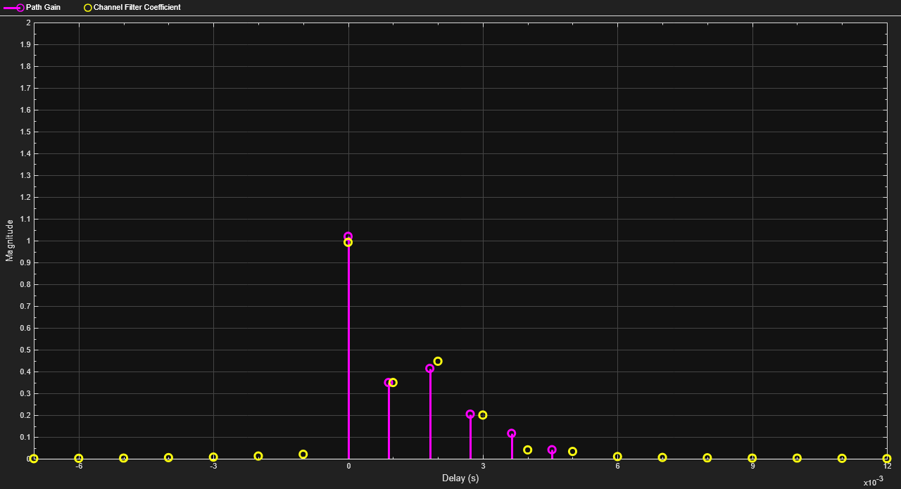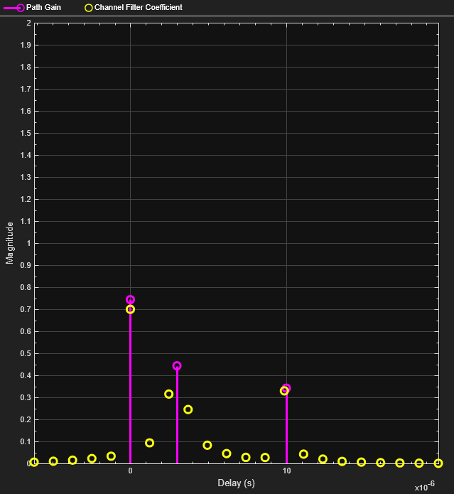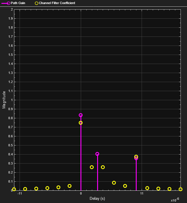 The impulse response plot displays the path gains and the channel filter coefficients. The path gains occur at time instances that correspond to the specified path delays and might not align with the input sampling time. The implementations interpolate the channel filter coefficients from the actual path gains, use the coefficients to model the channel, and align the coefficients with the input sampling time. When the path gains align with the sampling time, they overlap the channel filter coefficients.