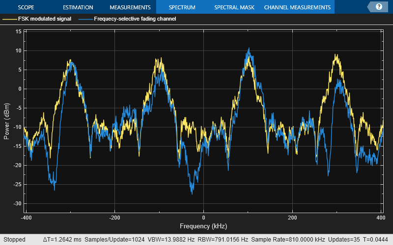 Plot the signal spectrum of the FSK-modulated signal before and after channel filtering. The four tones comprising the FSK signal maintain the same frequency separation and peak power levels relative to each other. The absolute peak power levels have decreased due to the fading channel.