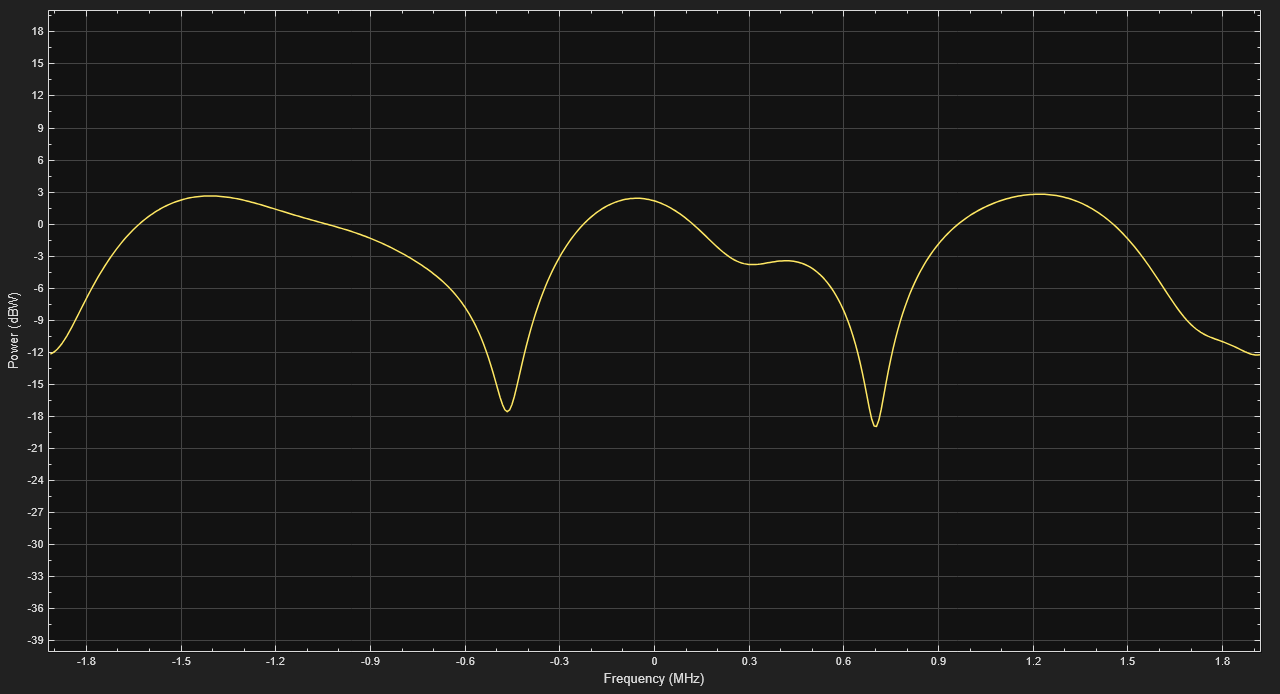 Plot the signal spectrum of the FSK-modulated signal before and after channel filtering. The spectrum has the same shape as in the flat-fading case, but the four tones are now separated by 200 kHz. There are still four identifiable tones, but their relative peak power levels differ due to the frequency-selective fading. The 800 kHz signal bandwidth is larger than the 50 kHz coherence bandwidth.