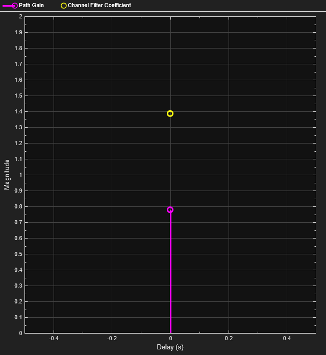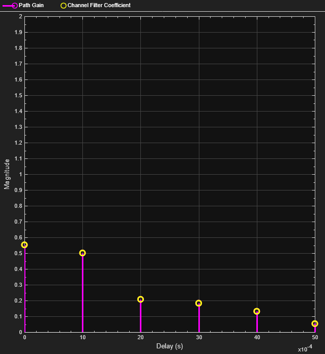This plot shows the impulse response for a Rayleigh fading channel configured with path gains that align with the sample timing. The path gains overlap with the channel filter coefficients, and the coefficients are equally distributed.