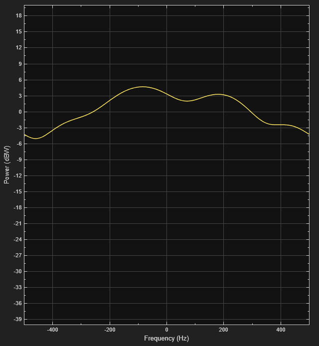 The frequency response plot displays the channel spectrum by taking a discrete Fourier transform of the channel filter coefficients. For the MIMO case, this transform is performed for the specified transmit-receive antenna pair. The default settings use a rectangular window. The window length is set according to the channel model configuration. The y-axis limits of the plot are computed based on the normalized and average path gain values.