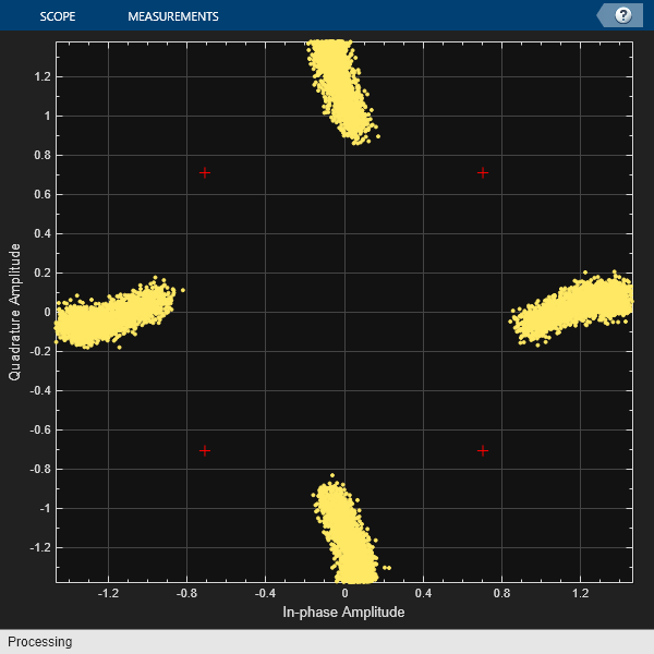 The QPSK constellation shows the effects of the fading channel; however, the signal still has four identifiable states.