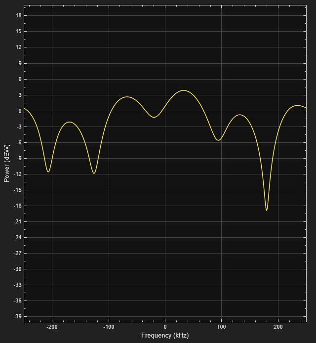 Increase the symbol rate to 500 kbps and update the related channel property. Pass the signal through the Rayleigh channel and apply AWGN.