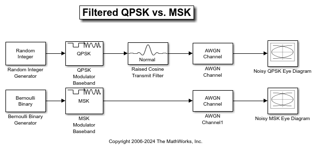 The cm_qpsk_vs_msk model compares filtered quadrature phase shift keying (QPSK) and minimum shift keying (MSK) modulation schemes.