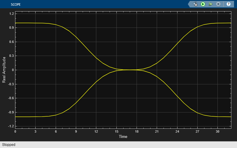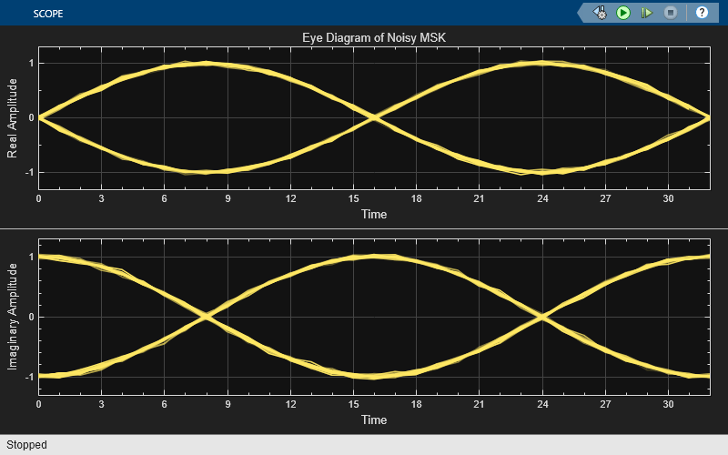 Eye Diagram blocks are named to reflect the signal each displays. When you run the example, these Eye Diagram blocks show how the CPM signal changes over time: