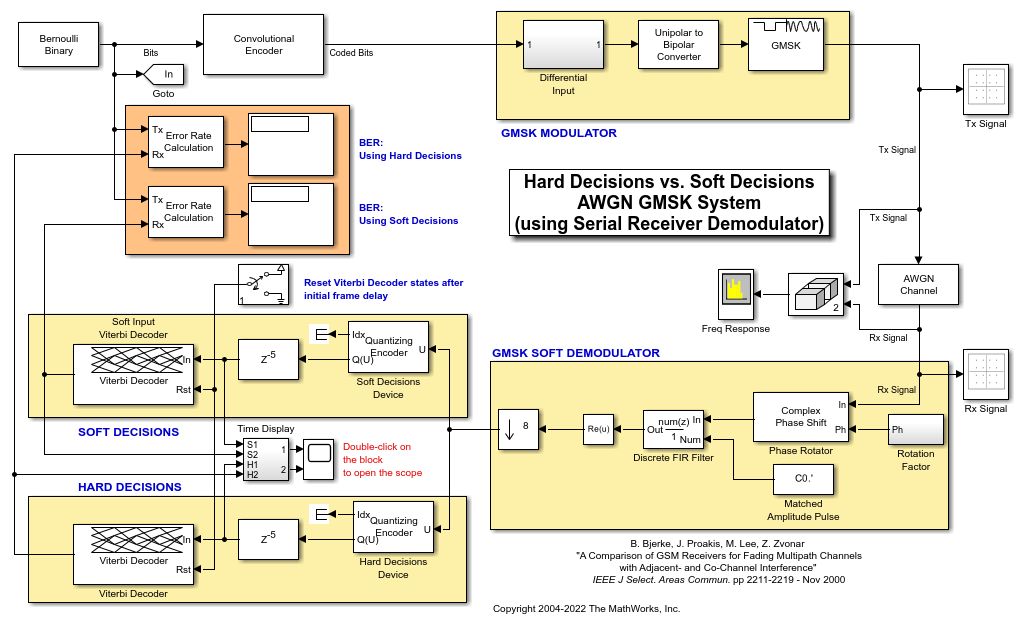 GMSK soft demodulator section to implement the detector design proposed in [ 1 ], called a serial receiver. This section of the model produces a noisy bipolar signal. The section labeled Soft Decisions uses an eight-region partition in the Quantizing Encoder block to prepare for 3-bit soft-decision decoding using the Viterbi Decoder block. The section labeled Hard Decisions uses a two-region partition to prepare for hard-decision Viterbi decoding. Using a two-region partition here is equivalent to having the GMSK Demodulator Baseband block make hard decisions. In each decoding section, a Delay block aligns codeword boundaries with frame boundaries so that the Viterbi Decoder block can decode properly. This signal alignment is necessary because the combined delay of other blocks in the system is not an integer multiple of the length of a codeword.