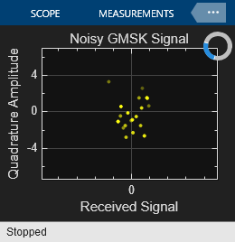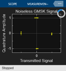 Modulated Signal block — Displays the in-phase and quadrature signals. Double-click the block to open the scope. The modulated signal is easy to see in the eye diagram only when the Modulation index parameter in the CPM Modulator Baseband block is set to 1/2. For a modulation index value of 2/3, the modulation is more complex and the features of the modulated signal are difficult to decipher. Unwrapping the phase and plotting it is another way to illustrate these more complex CPM modulated signals.