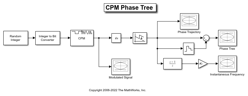 The doc_cpm_phase_tree model uses the Eye Diagram block to view the in-phase and quadrature components, phase trajectory, phase tree, and instantaneous frequency of a CPM modulated signal.