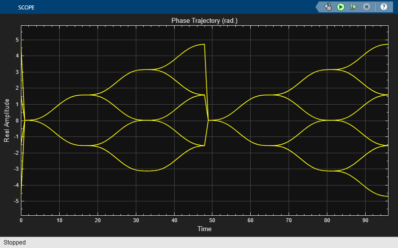 Phase Tree block — Displays the phase tree of the signal. The CPM phase is processed by a few simple blocks to make the CPM pulse shaping easier to view. This processing holds the phase at the beginning of the symbol interval and subtracts it from the signal. This zero-order hold resets the phase to zero every three symbols. The resulting plot shows the many phase trajectories that can be taken by the signal from any given symbol epoch.