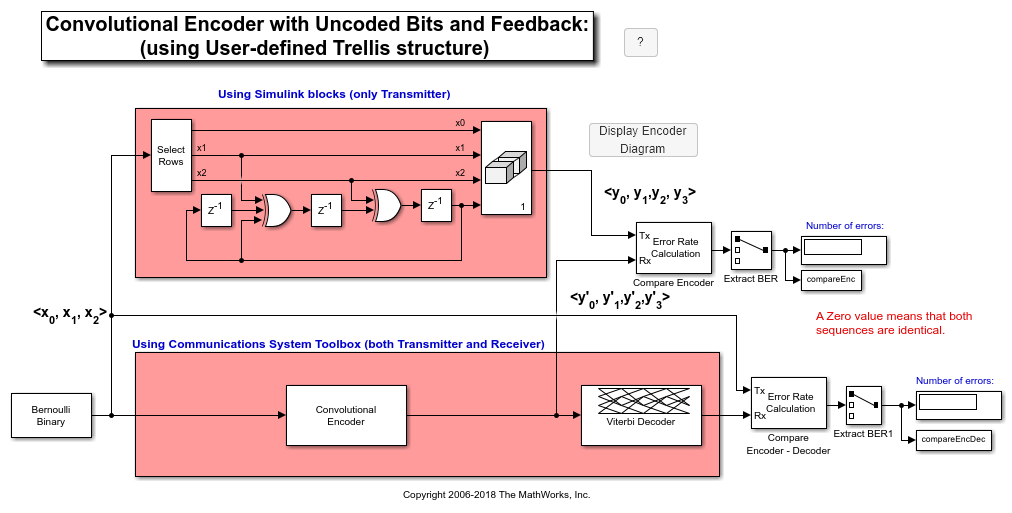 The model serves as a unit test bench for the convolutional code implemented. The model shows how to define and use a trellis that describes a convolutional code. The particular code in this example cannot be described by a set of generator and feedback connection polynomials. The code's trellis cannot be created by the poly2trellis because that function expects generator and feedback connection polynomials as input arguments.