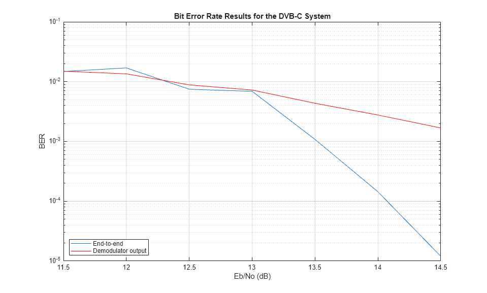 EbNo = 11.5:0.5:14.5; useScopes = false; useCodegen = false; compileIt = false; if compileIt % Make EbNo input var-size row vector (max length = 100) codegen runDVBCSystemUnderTest -report -args {coder.Constant(useScopes),coder.Constant(prmDVBC), coder.Constant(num), 1, coder.typeof(EbNo,[1 100],[false true]), 1, 1} end if useCodegen % Constant inputs do not appear in call to generated code version [berEnd2End, berDemod] = runDVBCSystemUnderTest_mex(useScopes, prmDVBC, num, sigPower, EbNo, totalErrors, totalBits) else [berEnd2End, berDemod] = runDVBCSystemUnderTest(useScopes, prmDVBC, num, sigPower, EbNo, totalErrors, totalBits) end % plotDVBCResults(EbNo, berEnd2End, berDemod);