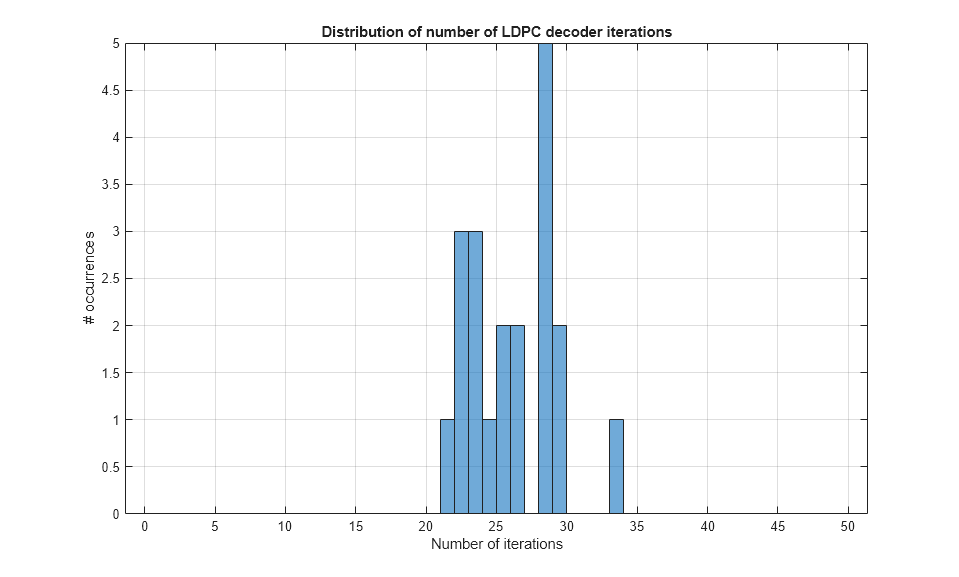 distFig = figure; histogram(numIterVec,1:dvb.LDPCNumIterations-1); xlabel('Number of iterations'); ylabel('# occurrences'); grid on; title('Distribution of number of LDPC decoder iterations')