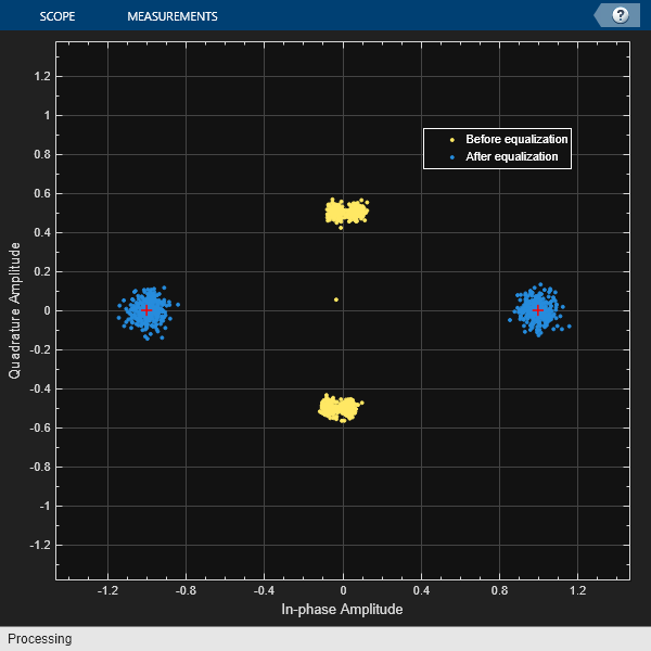 trSeq = modData(1:200); [eqSig,err] = lineq(rxSig,trSeq); constdiag = comm.ConstellationDiagram( ... NumInputPorts=2, ... ChannelNames={'Before equalization','After equalization'}, ... ReferenceConstellation=pskmod([0 M-1],M)); constdiag(rxSig(400:end),eqSig(400:end))
