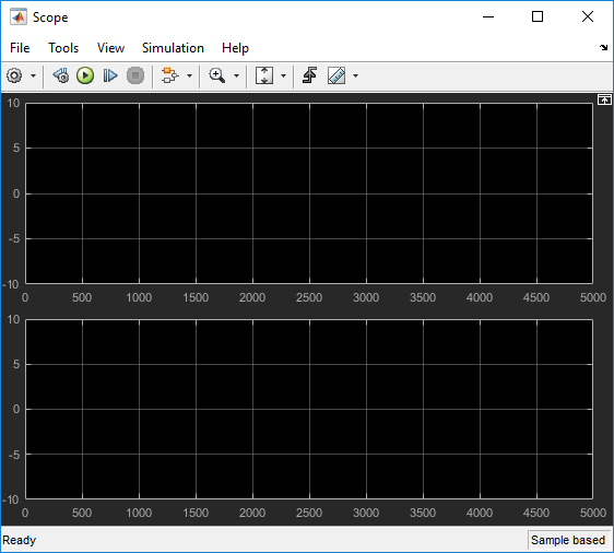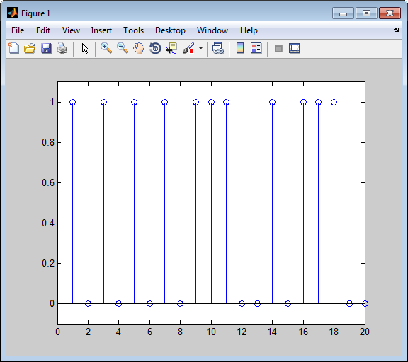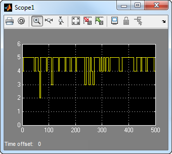 Running the model produces the following scope images. The plotted error count will vary based on the Initial Seed value used in the Random Integer Generator block. You can adjust the axis range exactly match that of the first scope. Right-click the plot area in the second scope and select Configuration Properties. On the Display tab, adjust the axes limits.