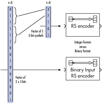 For all coding techniques except Reed-Solomon using binary input, the message vector must have length K and the corresponding code vector has length N. For Reed-Solomon codes with binary input, the symbols for the code are binary sequences of length M, corresponding to elements of the Galois field GF(2M). In this case, the message vector must have length M*K and the corresponding code vector has length M*N. The Binary-Input RS Encoder block and the Binary-Output RS Decoder block use this format for messages and codewords.