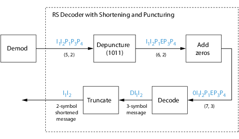 Example: Reed-Solomon Code in Integer Format. This example uses a Reed-Solomon code in integer format. It illustrates the appropriate vector lengths of the code and message signals for the coding blocks. It also exhibits error correction, using a simple way of introducing errors into each codeword.