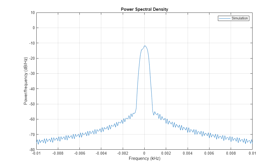figure; win = hamming(Ns/5); Noverlap = Ns/10; pwelch(g(:,2,1),win,Noverlap,[],Rsamp,'centered') axis([-0.1/10 0.1/10 -80 10]); legend('Simulation');