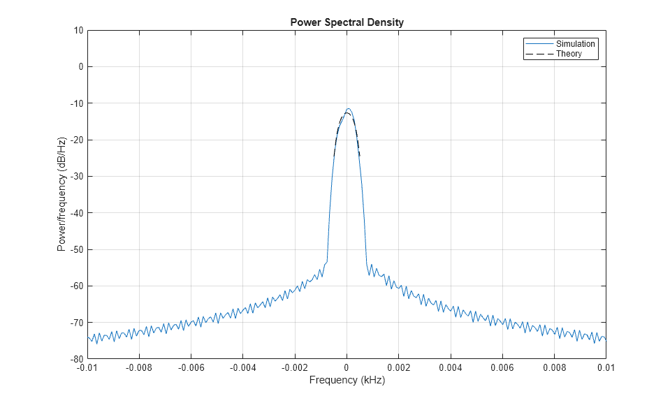 figure; pwelch(g(:,2,2),win,Noverlap,[],Rsamp,'centered') axis([-0.1/10 0.1/10 -80 10]); legend('Simulation'); hold on; plot(f(Sd>0)/1e3,10*log10(Sd(Sd>0)),'k--'); legend('Simulation','Theory');