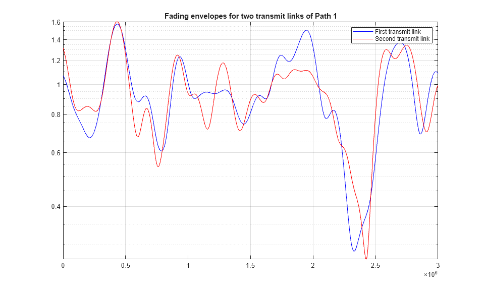 For each path, we plot the fading envelope waveforms of both transmit links. We can observe a correlation between the fading envelopes.