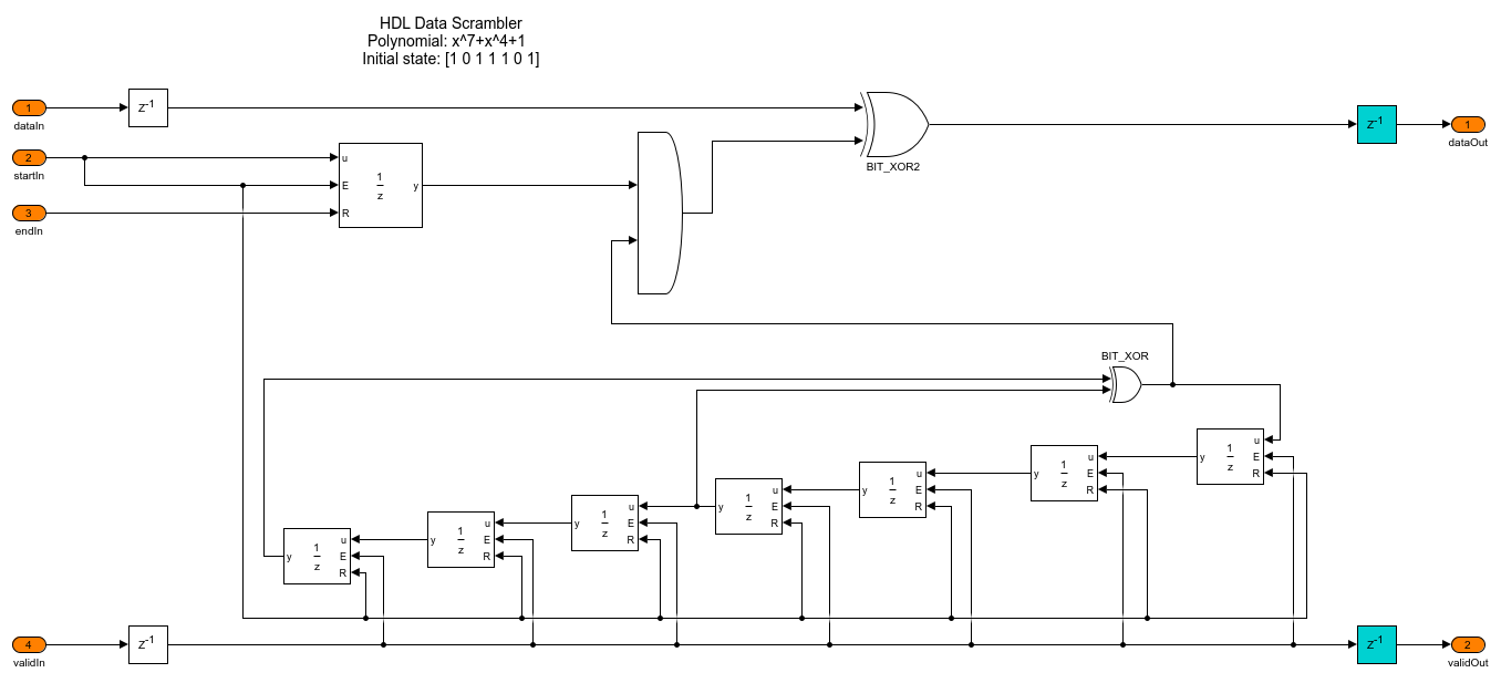 The HDL Data Scrambler subsystem scrambles the data bits in each packet by using the control signals generated by the Bits Generator subsystem.