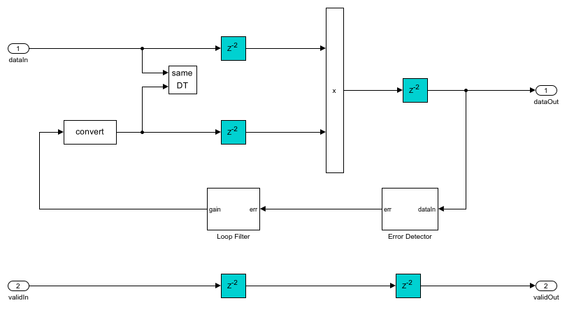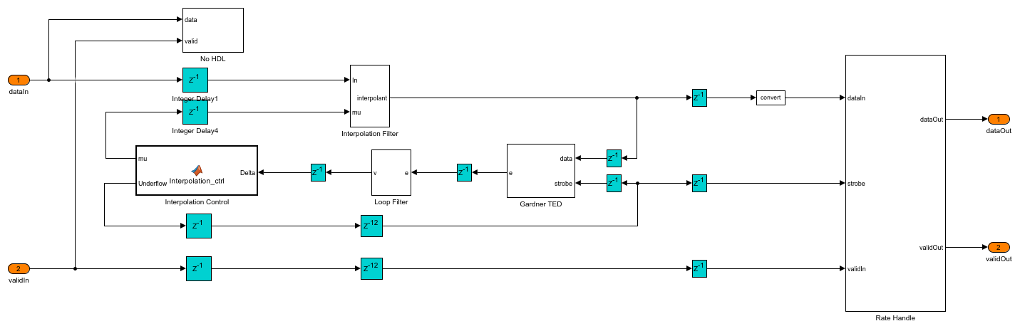 of the coefficients is taken as 0.5) of [ 1 ]. This filter introduces fractional delays in the input waveform. The Gardner TED subsystem implements a Gardner timing error detector. The timing error detector is described in Chapter 8.4.1 of [ 1 ]. The Loop Filter subsystem filters the timing error and the timing error is passed on to the Interpolation Control function block. This block implements a mod-1 decrementing counter to calculate fractional delays based on the loop filtered timing error as described in Chapter 8.4.3 of [ 1 ] to generate interpolants at optimum sampling instants. The Rate Handle subsystem selects samples if there is a strobe signal and stores them in a FIFO. These samples correspond to the maximum eye opening of the eye diagram before symbol synchronization.