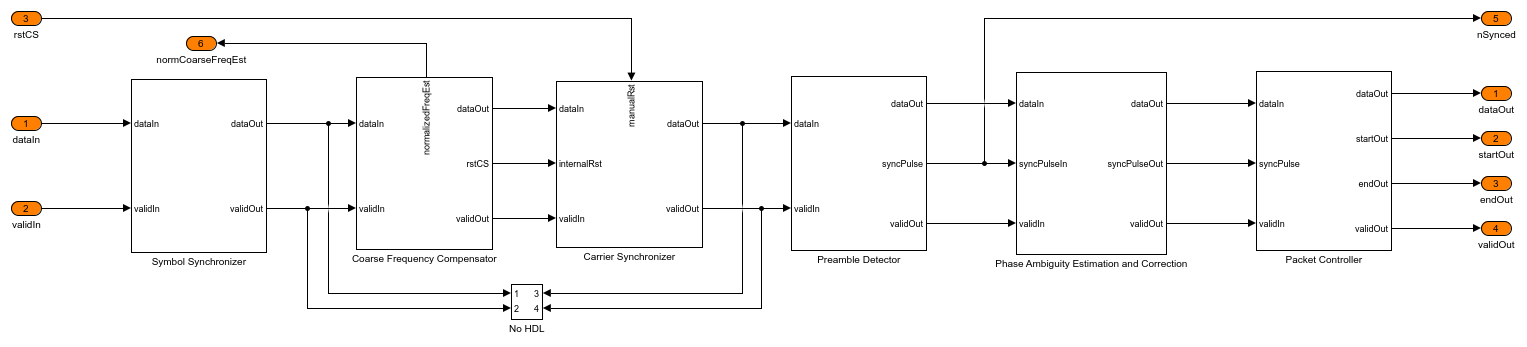 The Symbol Synchronizer subsystem is a PLL-based implementation. It generates samples at the optimum time instant (maximum eye opening instant) as described in Chapter 8.5 of [ 1 ]. The subsystem generates one output sample for every four input samples. The Interpolation Filter subsystem implements a piecewise parabolic interpolator with a hardware resource efficient farrow structure as described in Chapter 8.4.2, and the farrow coefficients are tabulated in Table 8.4.1 (the free parameter